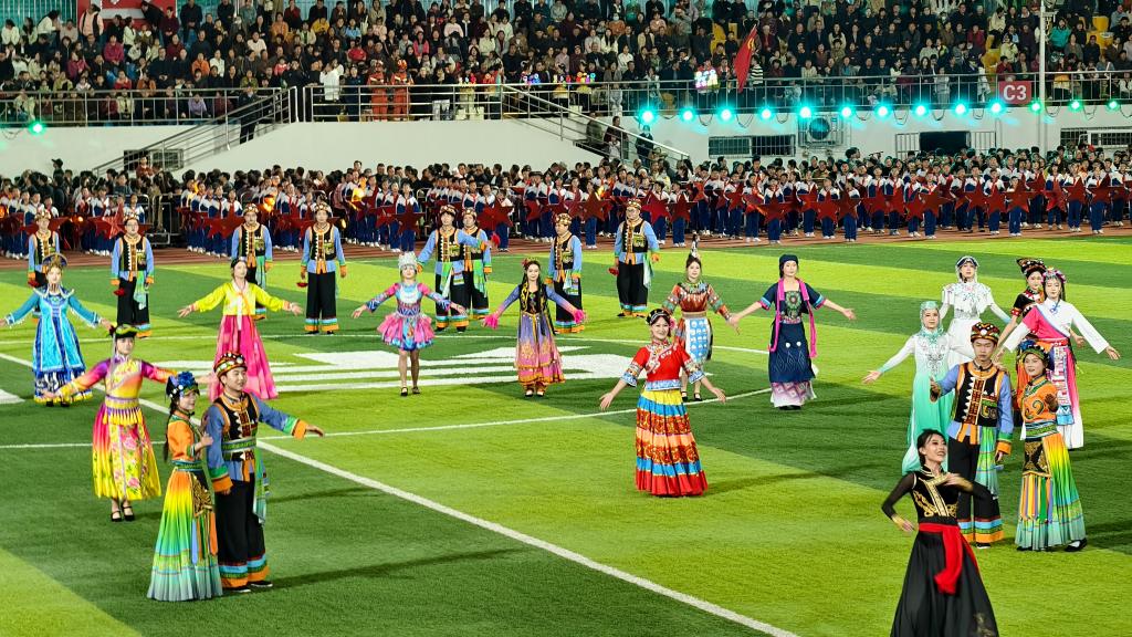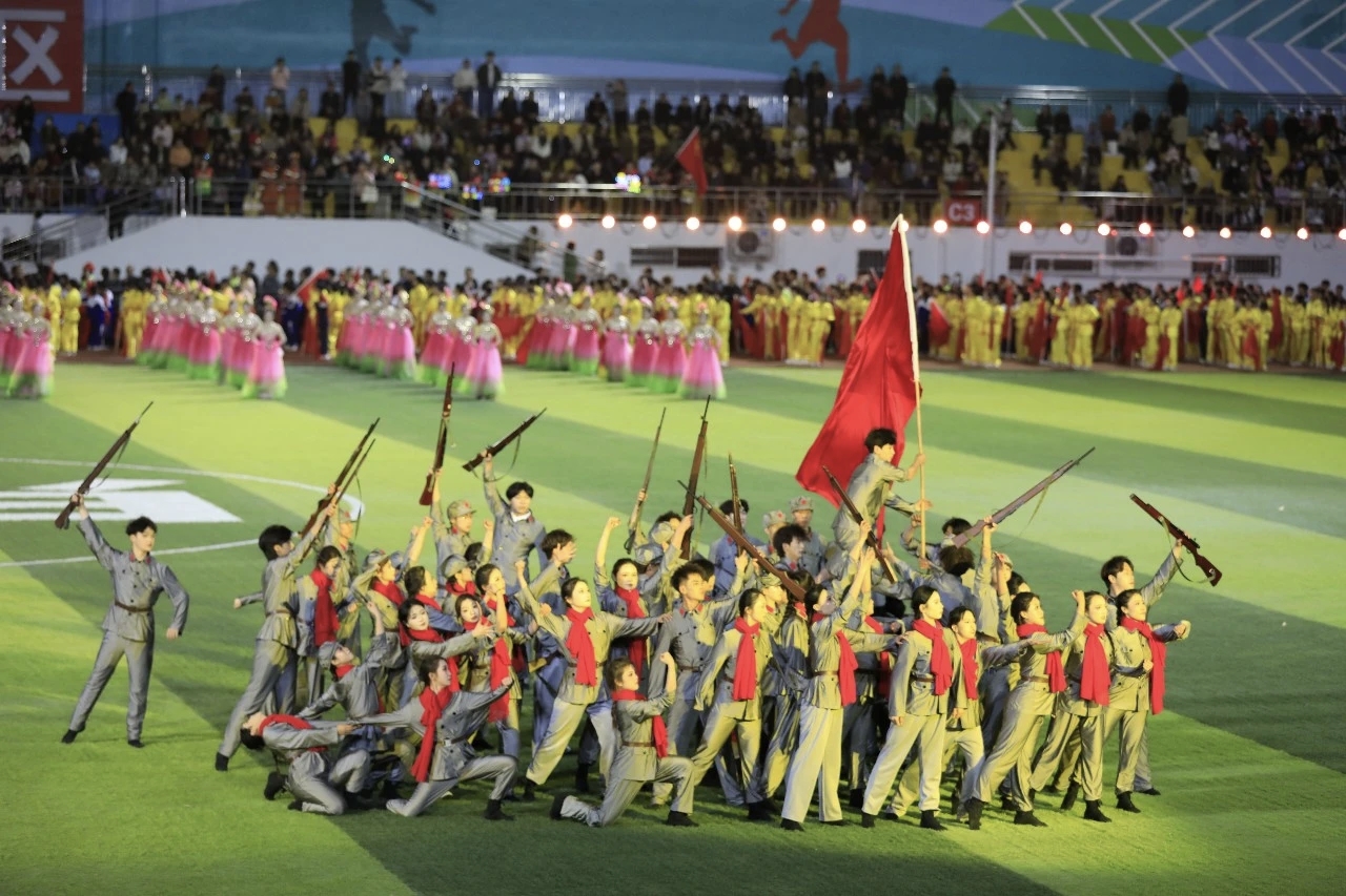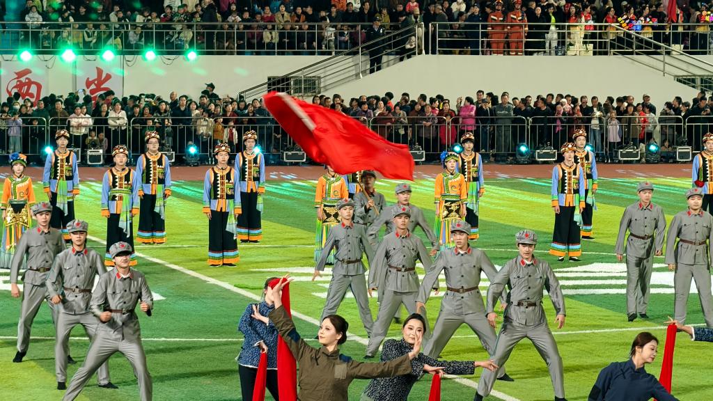 此次学院精心筹备两大特色节目,在开幕式上惊艳亮相。其中,《山河回响・红韵两当》深度挖掘国家级非物质文化遗产“两当号子”的文化内涵与红色底蕴,以原汁原味的高亢唱腔与情景化演绎,让这一本土非遗文化在村超舞台焕发时代活力;红色舞蹈《跨越百年》以铿锵有力的舞姿,回望革命百年征程、传承红色薪火,与两当“红色福地”文旅发展定位高度契合。